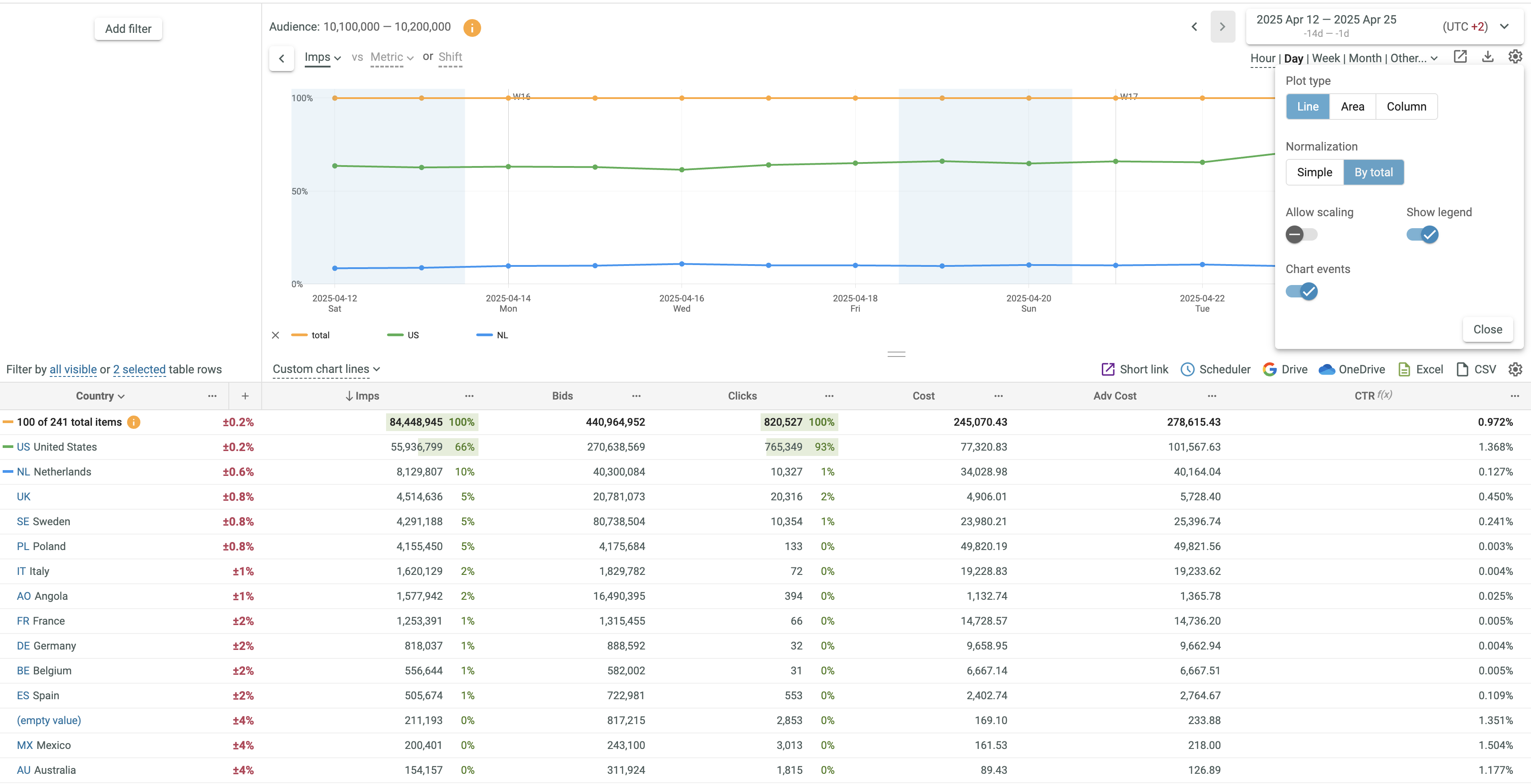 Normalization by Total is very useful, if you want to see % of each selected Plot relative to Total.